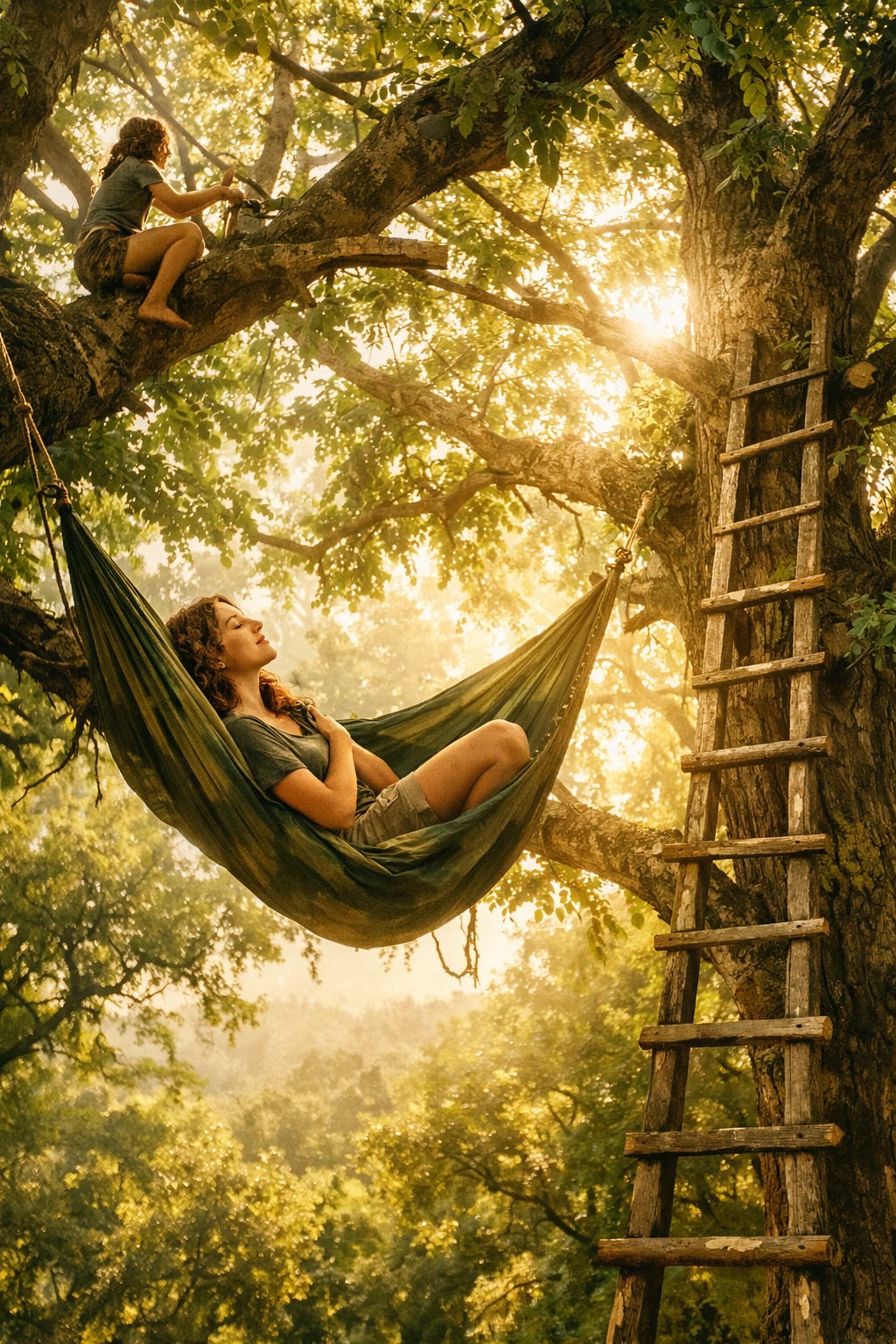 Mein Baumhaus hängt zwischen drei Bäumen wie ein Zweifel. Man erreicht es über eine Leiter, aber was für eine Leiter! Die Sprossen sind so schmal, dass ich glaube, sie seien für Kinder gemacht. Oder für Menschen, die verlernt haben, schwer zu sein. Ich klettere hoch, mein Rucksack schlägt gegen meinen Rücken, und jeder Schritt fühlt sich an wie ein kleiner Verrat an der Schwerkraft.