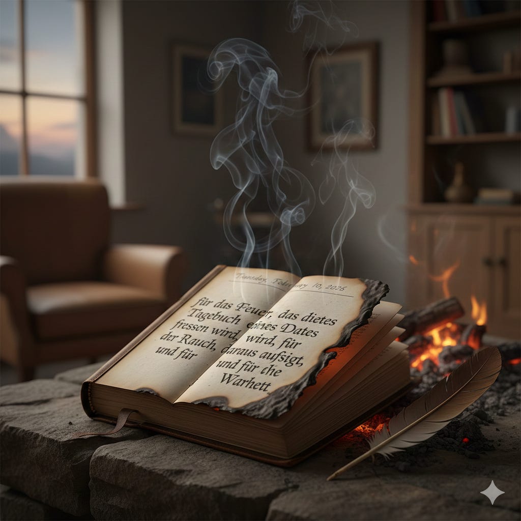 Meine Therapeutin sagte, schreib auf, wofür du dankbar bist, und ich schrieb: für das Feuer, das dieses Tagebuch eines Tages fressen wird, für den Rauch, der daraus aufsteigt, und für die Wahrheit.